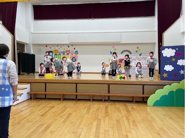セリフや歌を覚えて、ピアノに合わせて踊ったり、舞台を移動したり、覚えることが沢山の年長さんの劇。大きな声でセリフが言えるように只今絶賛練習中。