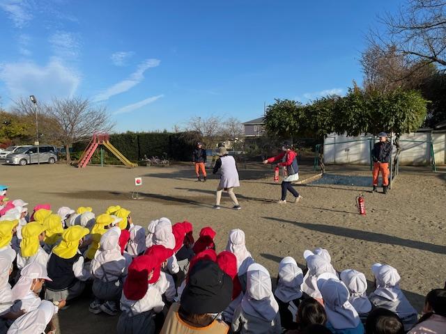 「火事だー」と、大きな声で叫び、消火後の避難通路を確認してから🧯消火器🧯を使って🔥火🔥を消しました。「先生頑張れ――!!」と子ども達が応援してくれました😊