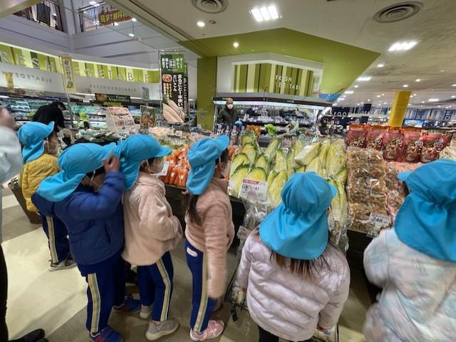 今回の食育学習では、栄養についてのお話を聞いたり、お買い物したり、お店の中を見学したり、楽しく学習することが出来ました。帰りにお土産ももらい、大満足な子どもたちでした。